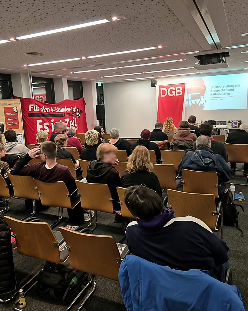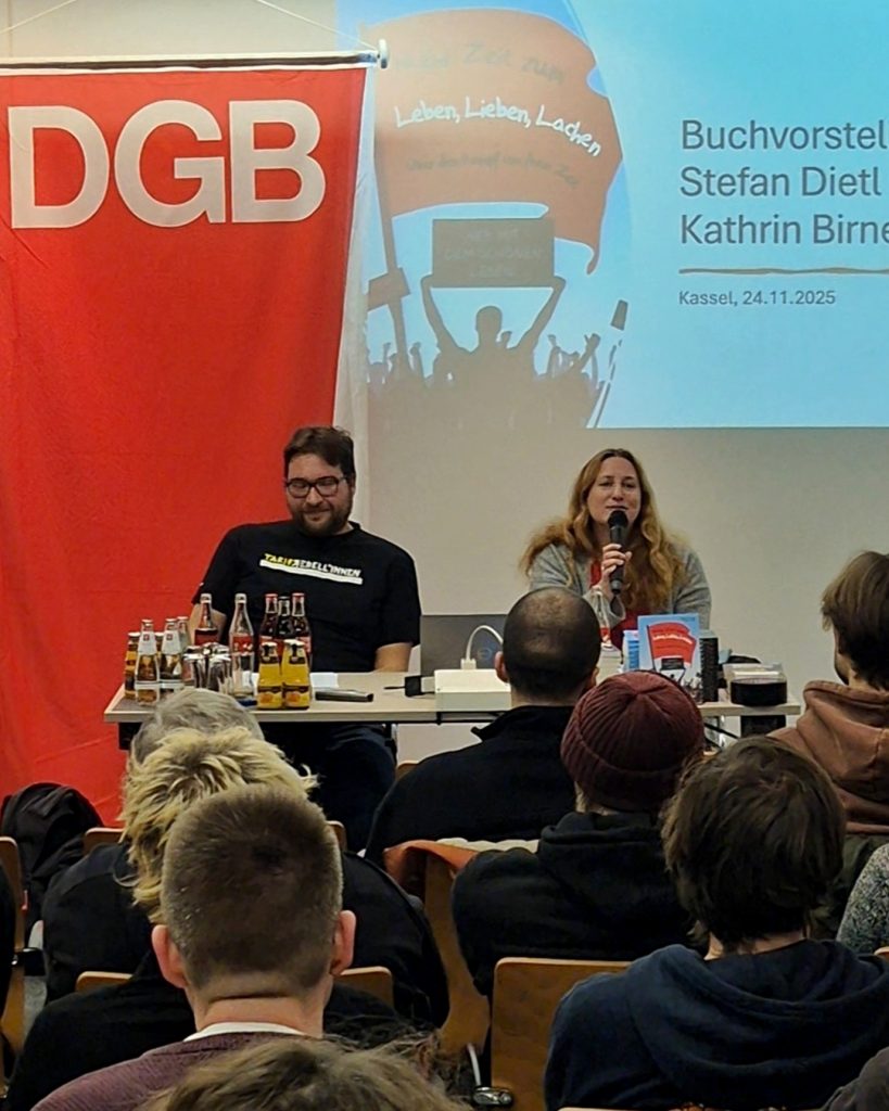 Vor der Veranstaltung haben wir die Möglichkeit genutzt, Kathrin & Stefan zu ihrem neuen Buch zu interviewen. Es geht um das politische Klima in Deutschland im Herbst 2025, um Geschichte & Aktualität der Kämpfe um Zeit und um ihre Einschätzung zum Potenzial der Forderung nach radikaler Arbeitszeitverkürzung. Hier ihre Antworten zu unseren Fragen – hört selbst: